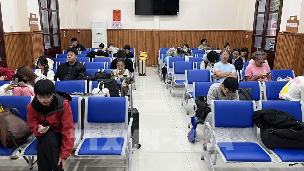 Hành khách chờ đợi lên tàu SE4 khi ngập lụt khiến hoạt động đường sắt bị đình trệ tại Huế. Ảnh: Văn Dũng-TTXVN