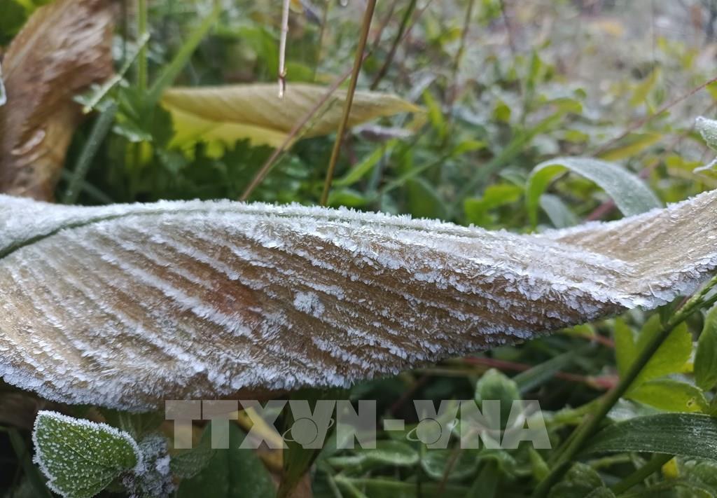 Sương muối tạo thành lớp băng mỏng trên cây cỏ. Ảnh: Đức Thọ - TTXVN