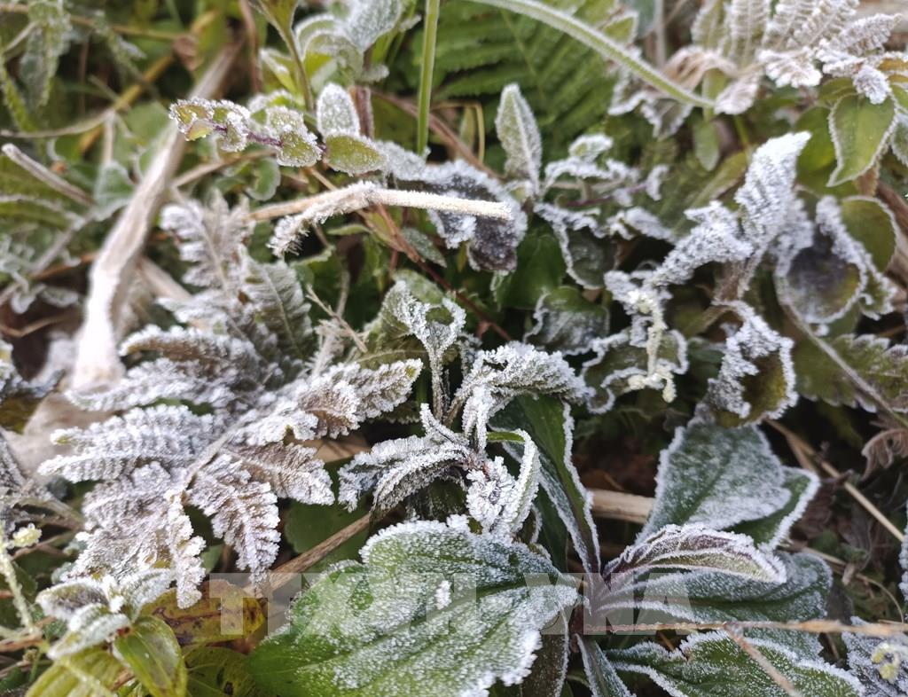 Sương muối tạo thành lớp băng mỏng trên cây cối. Ảnh: Đức Thọ - TTXVN