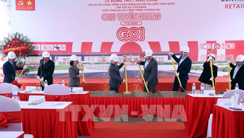 Các đại biểu thực hiện nghi thức động thổ công trình GO! Tuyên Quang. Ảnh: Quang Cường - TTXVN