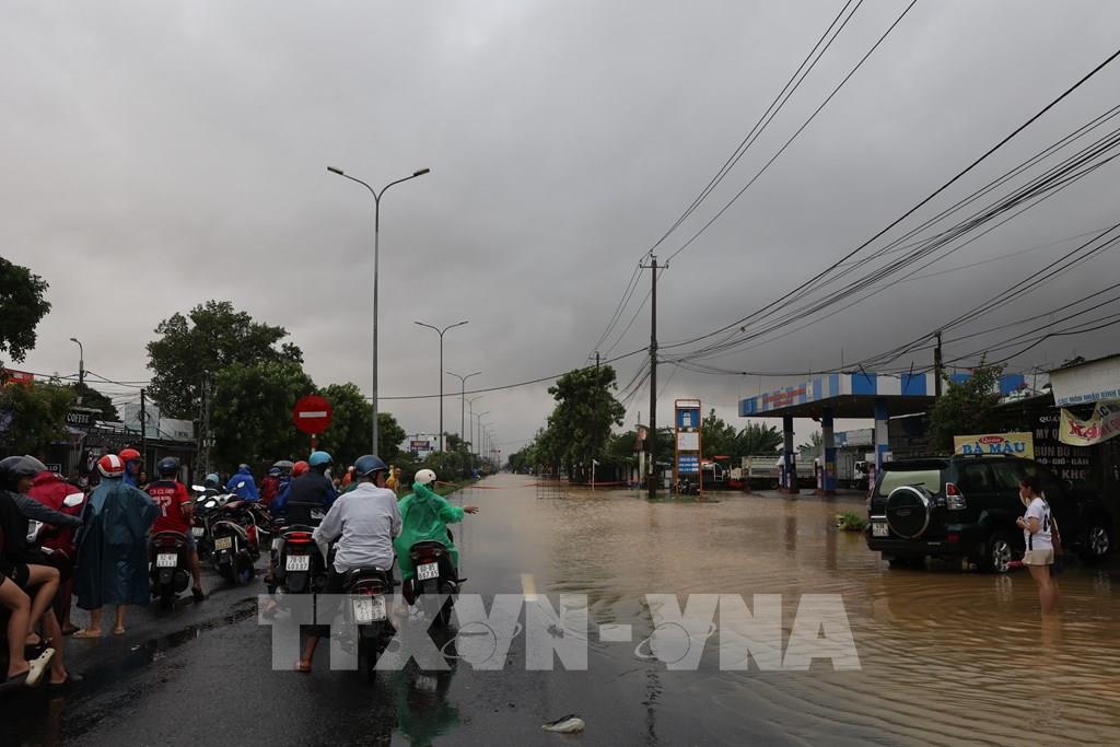 Quốc lộ 1A đoạn đi qua phường Điện Bàn bị ngập, phương tiện không thể qua lại. Ảnh: Anh Dũng – TTXVN