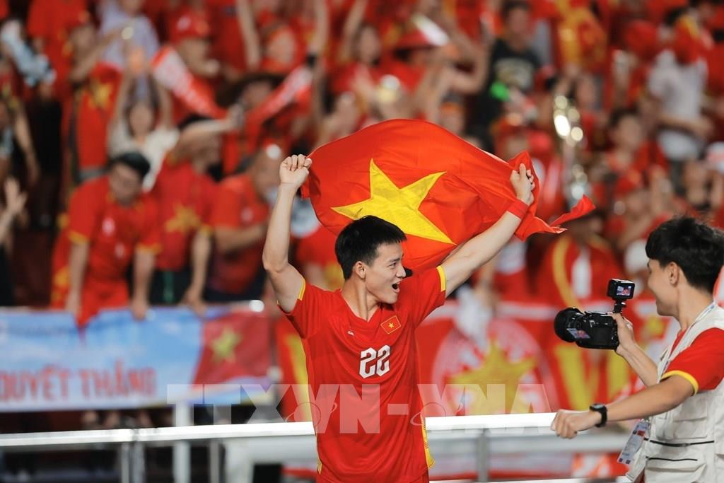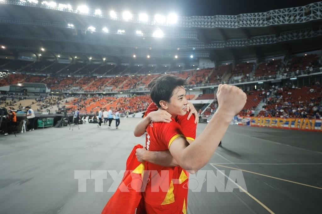 Niềm vui tột độ của người hâm mộ Việt Nam trên sân Rajamangala khi đội nhà giành chiến thắng. Ảnh: Minh Quyết - PV TTXVN tại Thái Lan
