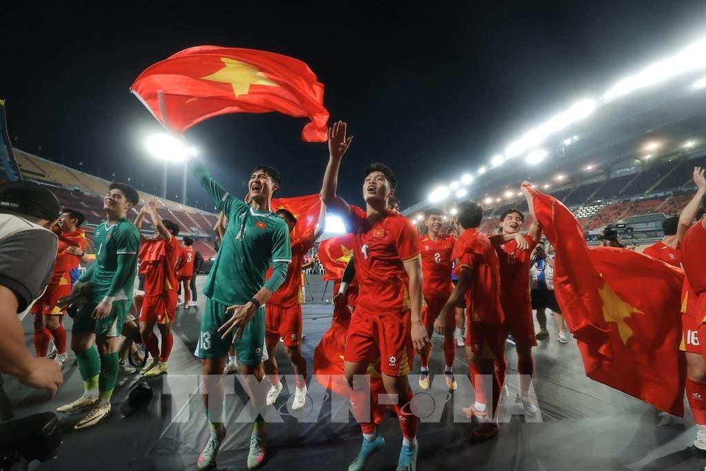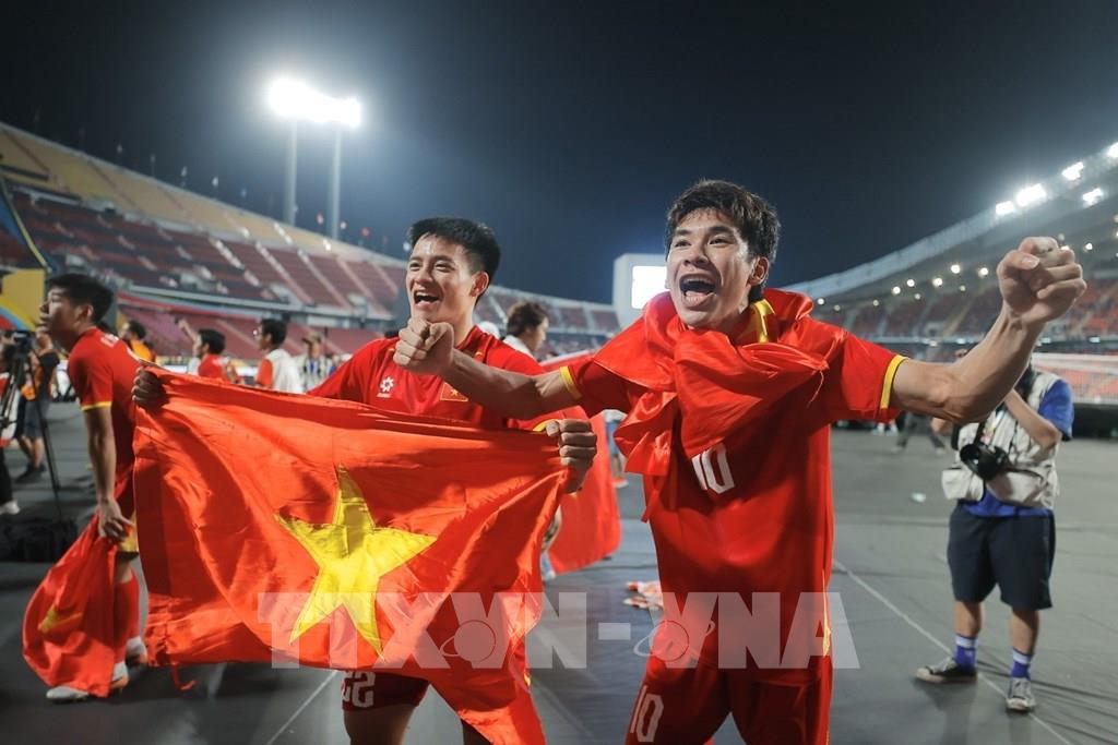 Các cầu thủ U22 Việt Nam hân hoan trong niềm vui chiến thắng. Ảnh: Minh Quyết - PV TTXVN tại Thái Lan