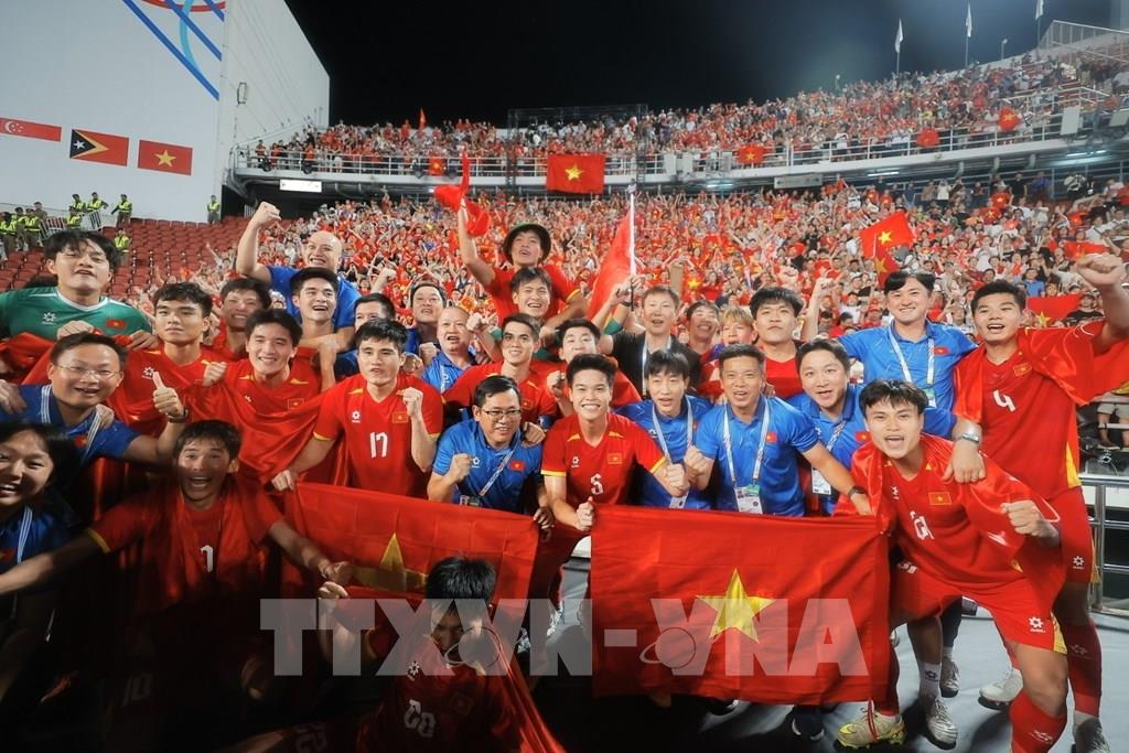 Các cầu thủ U22 Việt Nam hân hoan chia vui với người hâm mộ trên sân Rajamangala. Ảnh: Minh Quyết - PV TTXVN tại Thái Lan