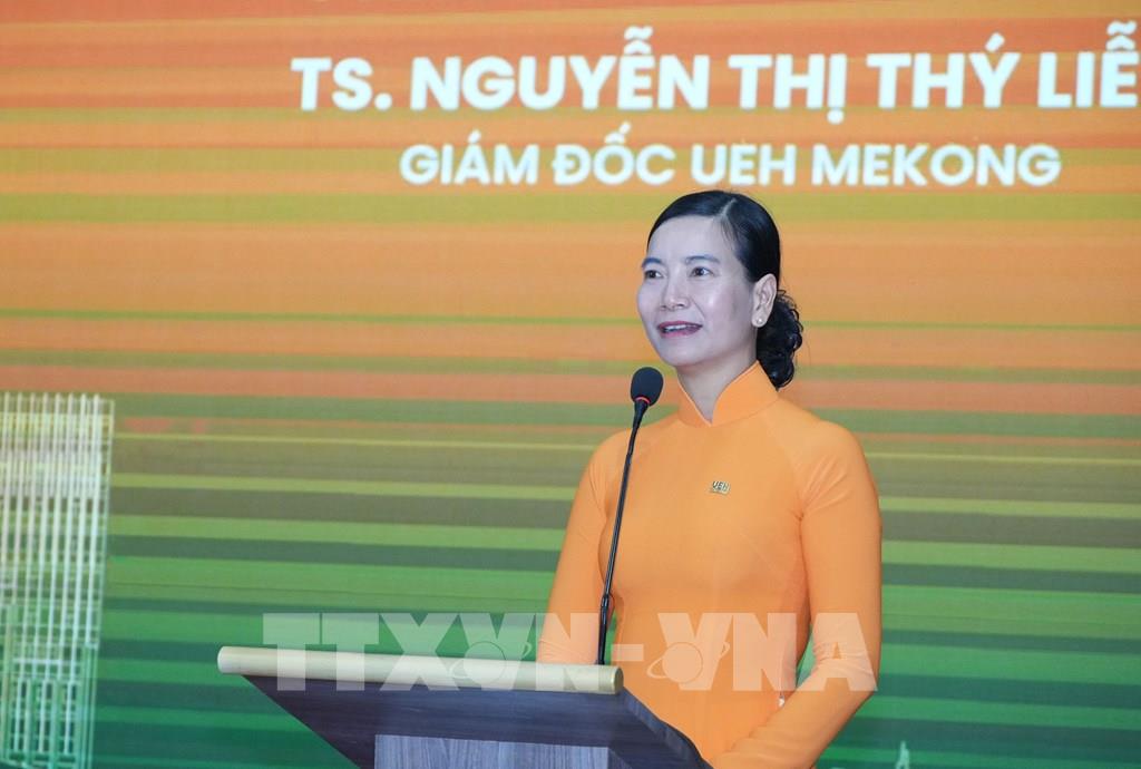 Tiến sĩ Nguyễn Thị Thý Liễu, Giám đốc Phân hiệu Đại học Kinh tế Thành phố Hồ Chí Minh tại Vĩnh Long phát biểu tại hội nghị. Ảnh: Phạm Minh Tuấn-TTXVN