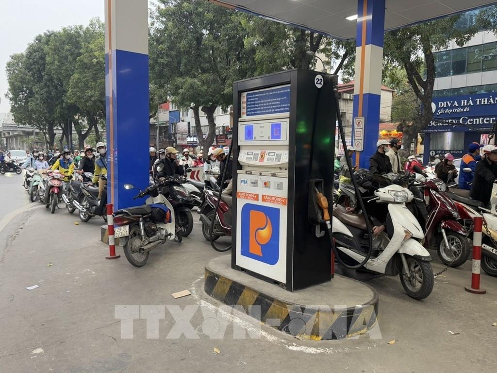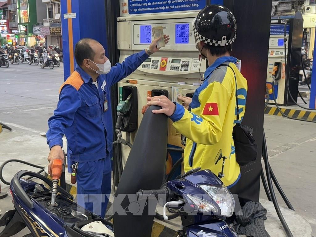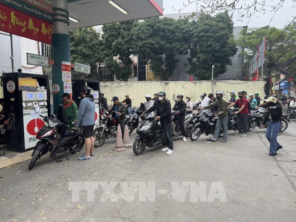 Nhân viên cây xăng phục vụ liên tục khi lượng phương tiện đến đổ xăng tăng mạnh trong những ngày gần đây. Ảnh: Quốc Luỹ - TTXVN