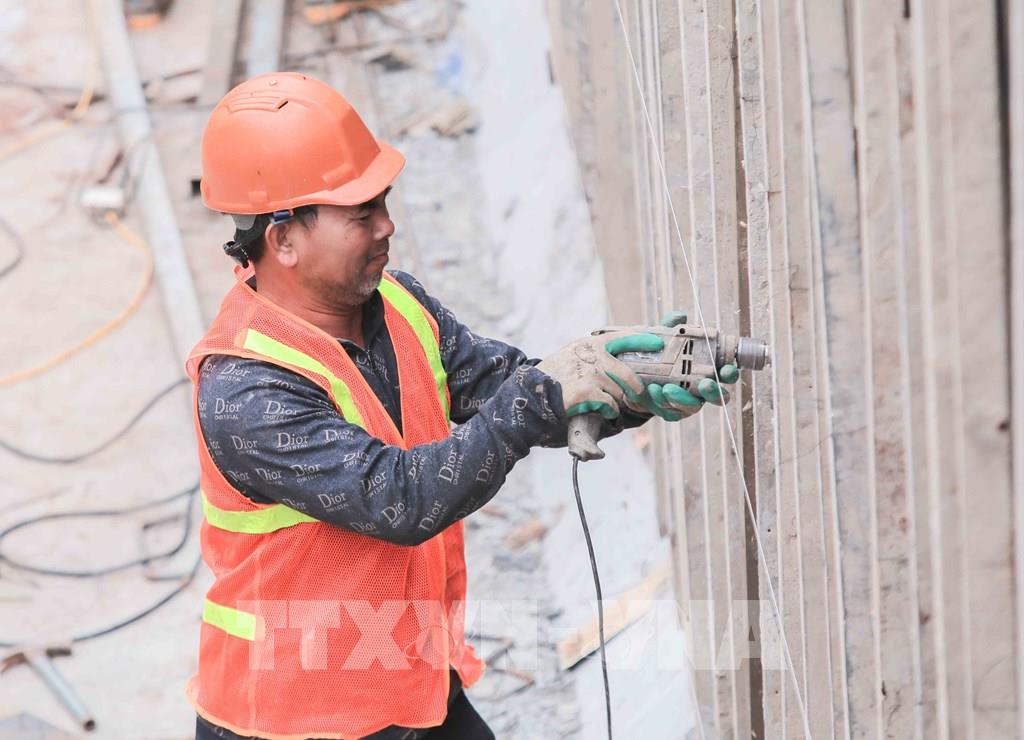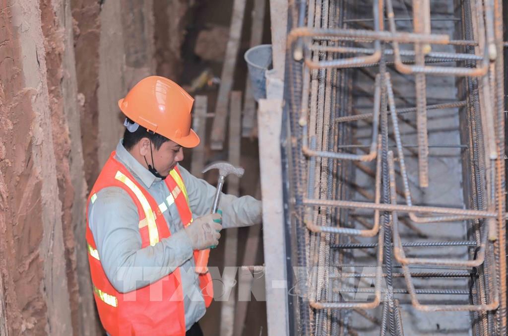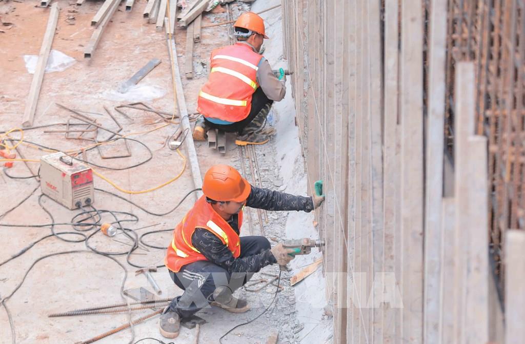 Công nhân gia công sắt, lắp đặt khung thép phục vụ đổ bê tông tại chỗ, bảo đảm kết cấu vững chắc. Ảnh: Phan Phương – TTXVN