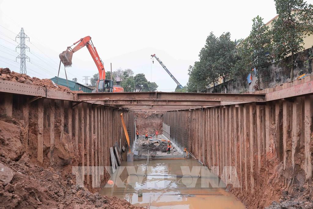Công nhân xử lý, hoàn thiện các mối nối cống tại đoạn Hoàng Tăng Bí, phường Đông Ngạc trong dự án cải tạo kênh Thụy Phương. Ảnh: Phan Phương – TTXVN
