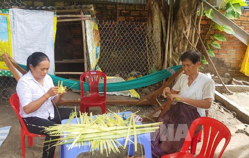 Chị em phụ nữ người dân tộc Khmer trên địa bàn xã Ô Lâm học cách đan vỏ bánh Kà tum tại nhà của Nghệ nhân Néang Phương. Ảnh: Công Mạo-TTXVN