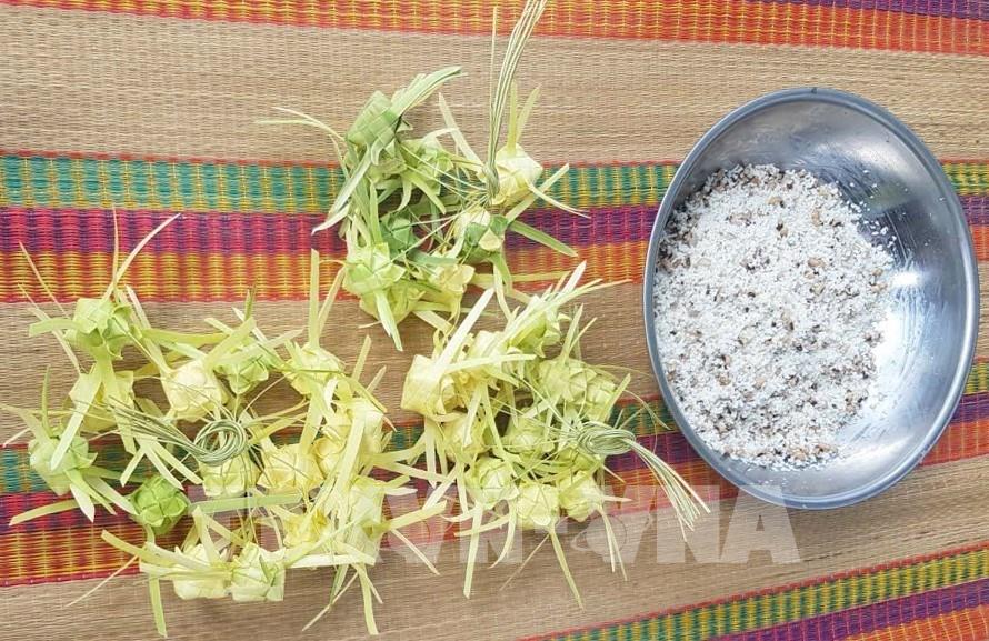 Sự tinh tế của bánh Kà tum nằm ở chỗ bánh là sự kết hợp của nông sản địa phương như gạo nếp ngâm kỹ, đậu trắng, lạc (đậu phộng) nấu chín, dừa nạo tay cùng chút đường, muối để cân bằng vị giác. Ảnh: Công Mạo-TTXVN