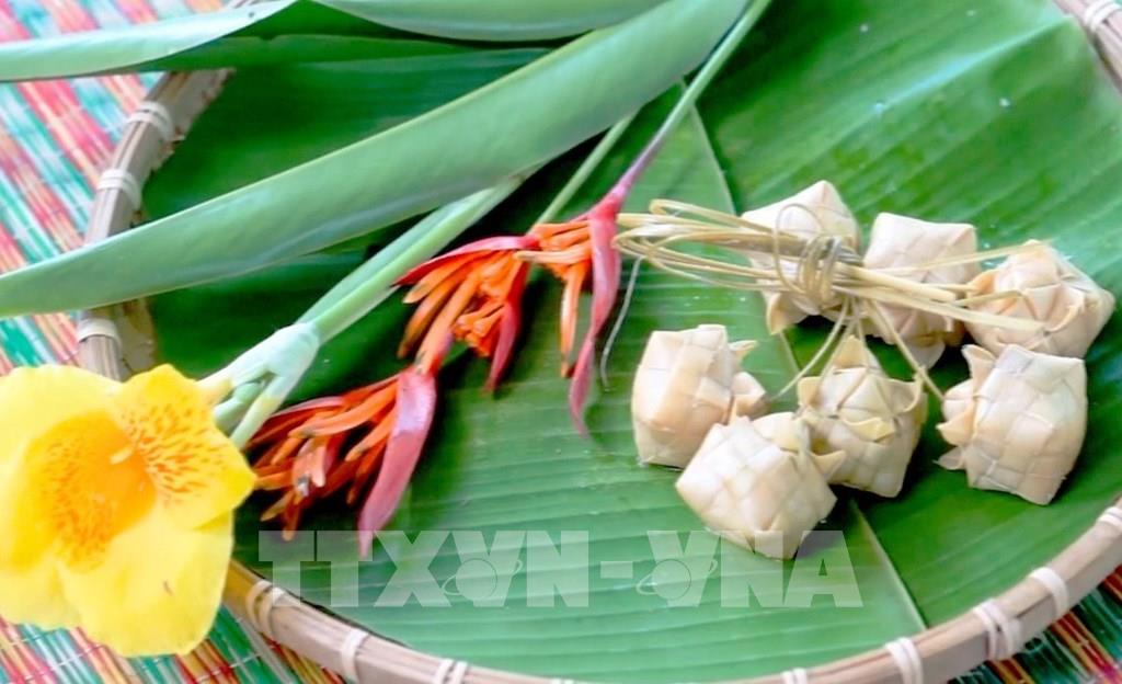 Những chiếc vỏ bánh Kà tum được đan từ lá thốt nốt non rất cầu kỳ, tạo điểm nhấn cho chiếc bánh truyền thống của người Khmer vùng Bảy Núi An Giang. Ảnh: Công Mạo-TTXVN