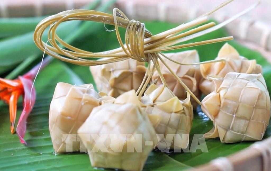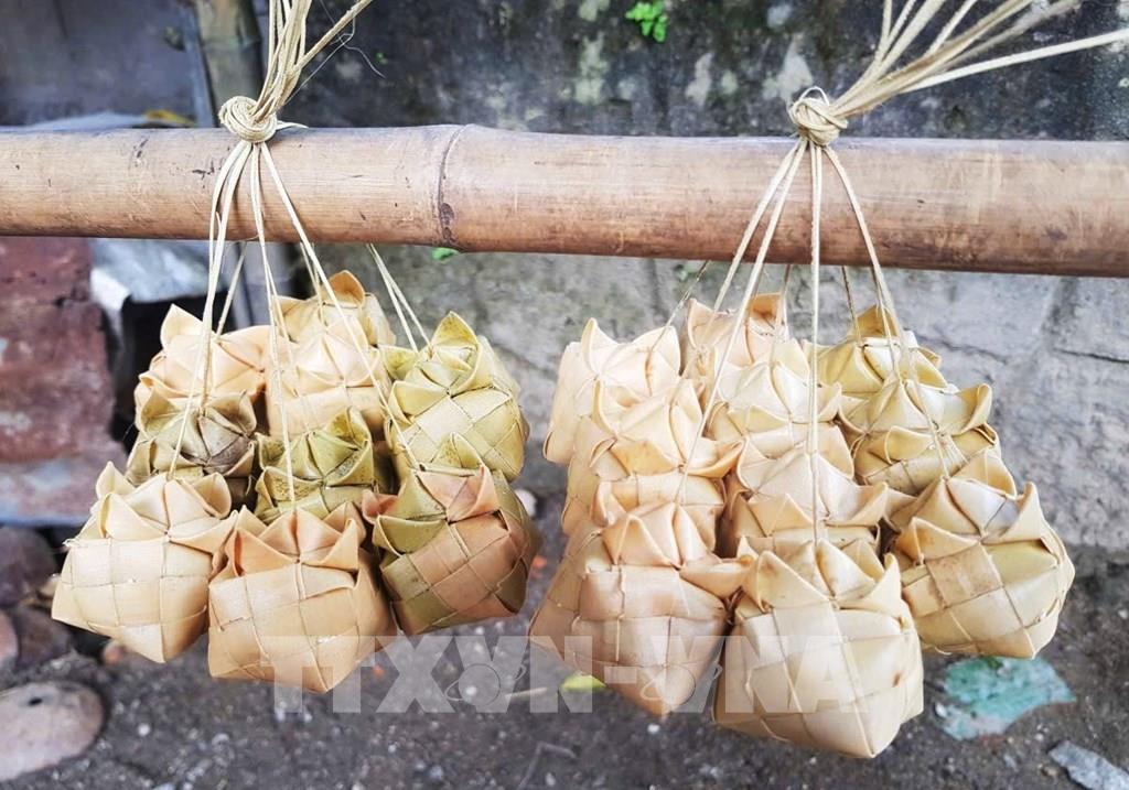 Việc sử dụng lá thốt nốt non làm vỏ không chỉ tạo mùi thơm đặc trưng khi luộc mà còn giúp bánh giữ được độ dẻo dai. Ảnh: Công Mạo-TTXVN