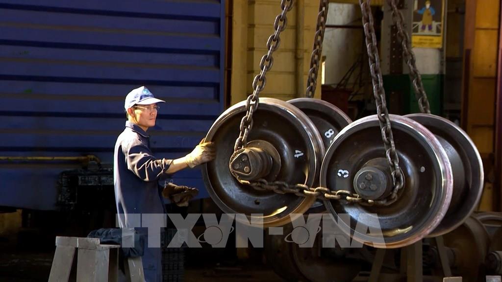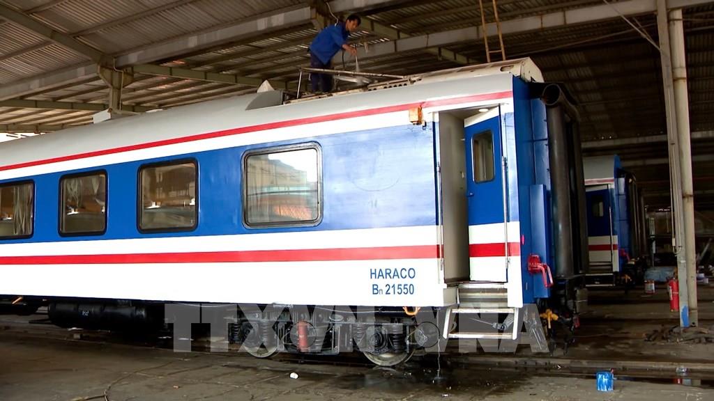 Các toa tầu mới lắp ráp đang được các công nhân hoàn thiện tại Công ty cổ phần xe lửa Dĩ An chờ đưa ra thị trường. Ảnh : Huyền Trang - TTXVN