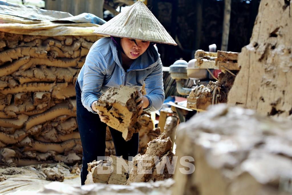 Người thợ chọn loại đất sét dẻo mịn từ những khu ruộng ngập úng, sau khi lọc sỏi được ủ hơn 20 ngày để đạt độ dẻo quánh lý tưởng. Ảnh: Đức Hạnh/Bnews/vnanet.vn