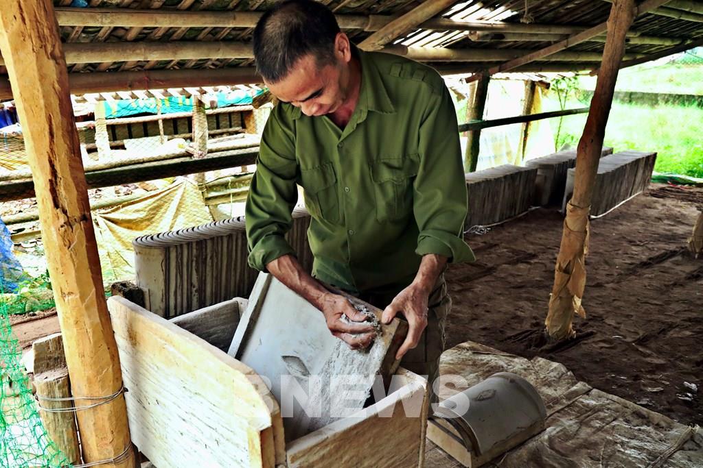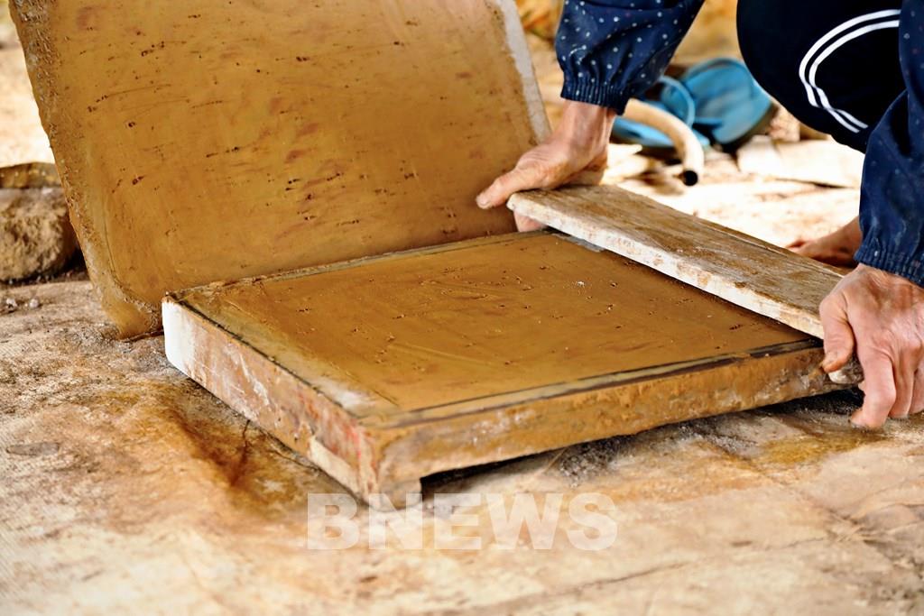 Đất được cắt từng khối , cho vào khuôn gỗ hình chữ nhật đã tráng tro để chống dính. Ảnh: Đức Hạnh/Bnews/vnanet.vn