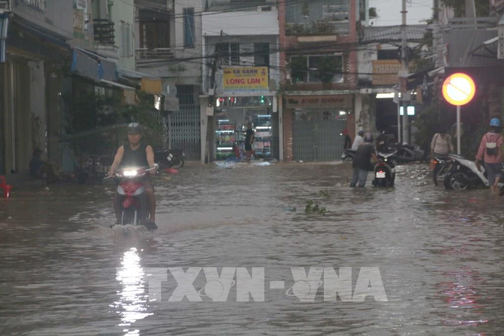 Triều cường dâng cao gây ngập nhiều tuyến đường ở Vĩnh Long. Ảnh: Phúc Sơn - TTXVN