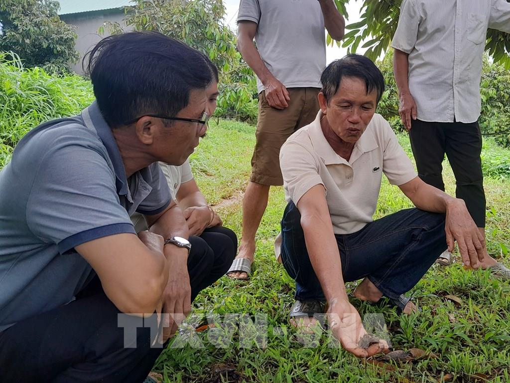 Ông Đậu Bá Trường (giữa), thành viên Tổ hợp tác sầu riêng sạch Phú Riềng đã thực hiện mô hình thuận theo tự nhiên giúp vườn luôn xanh tốt. Ảnh: K GỬIH-TTXVN