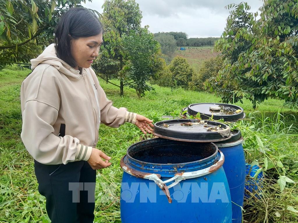 Phó Chủ tịch Hội Nông dân xã Phú Riềng Nguyễn Thị Thanh kiểm tra quy trình ủ phân đạm tại Tổ hợp tác sầu riêng sạch Phú Riềng. Ảnh: K GỬIH-TTXVN