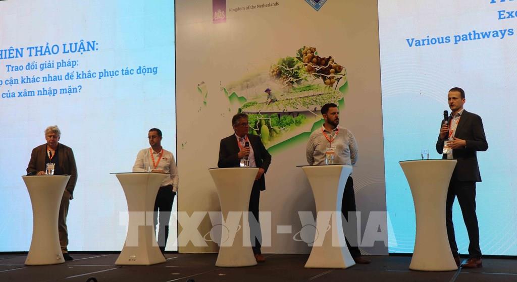 Đại diện khối công và tư từ Vương quốc Hà Lan chia sẻ những hướng tiếp cận khác nhau để khắc phục tác động của xâm nhập mặn. Ảnh: Thu Hiền - TTXVN