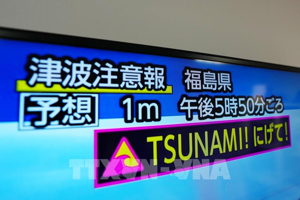 Cảnh báo sóng thần được ban bố trên truyền hình ở Tokyo, sau khi xảy ra trận động đất ở Đông Bắc Nhật Bản ngày 20/4/2026. Ảnh: Kyodo/TTXVN