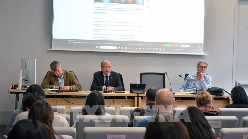 Đại sứ đặc mệnh toàn quyền Việt Nam tại Pháp Đinh Toàn Thắng (giữa) phát biểu tại hội thảo. Ảnh: Hữu Chiến - P/v TTXVN tại Pháp