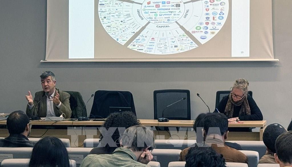 Phó Giáo sư Jean-Philippe Eglinger trình bày tham luận “Hướng tới việc xây dựng bản đồ các chủ thể chính trong hệ sinh thái đổi mới sáng tạo của Việt Nam". Ảnh: Hữu Chiến - P/v TTXVN tại Pháp