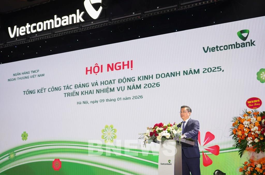 Ông Nguyễn Thanh Tùng, Chủ tịch HĐQT Vietcombank phát biểu tại Hội nghị tổng kết công tác Đảng và hoạt động kinh doanh năm 2025, triển khai nhiệm vụ năm 2026. Ảnh: VCB