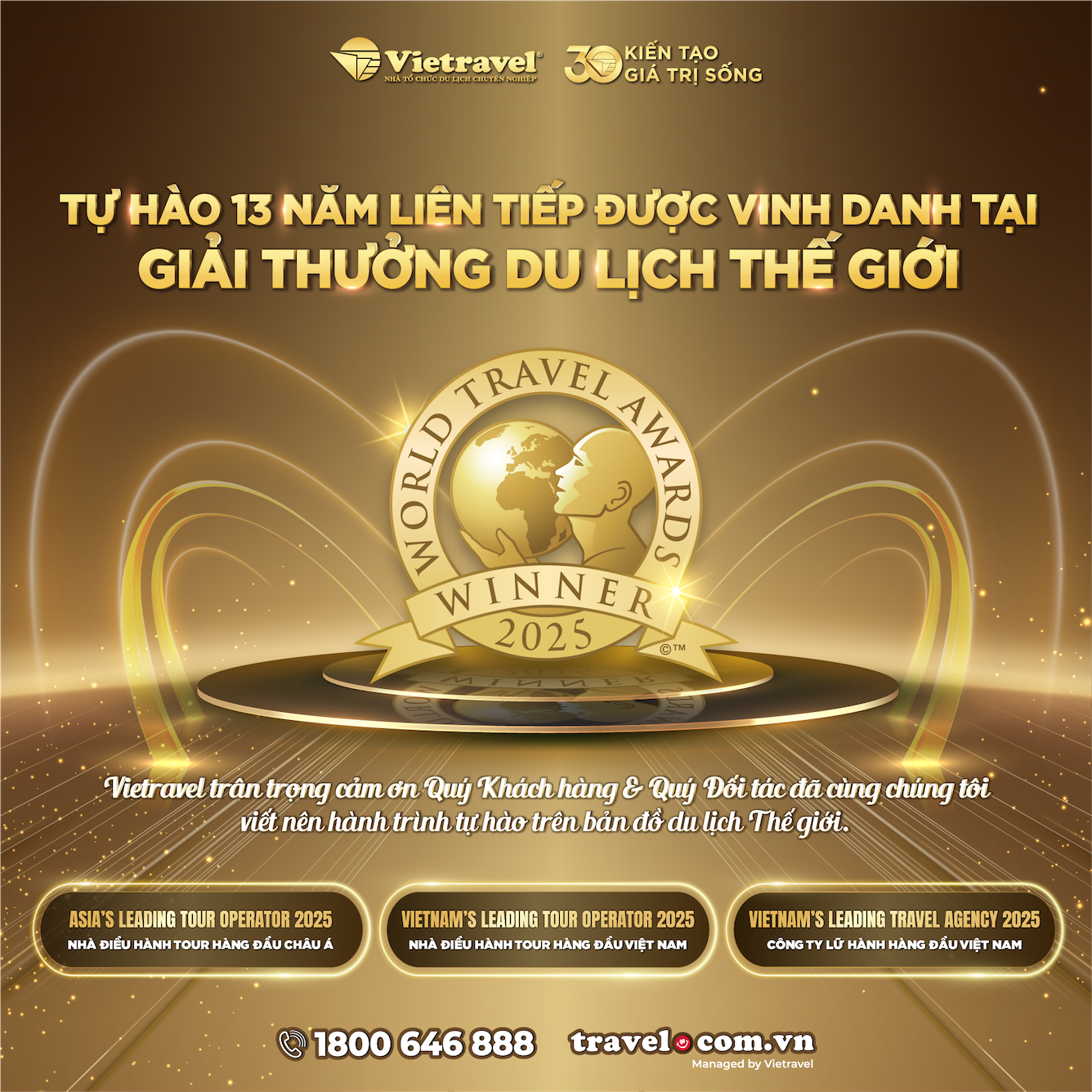Trải qua hơn ba thập kỷ, Giải thưởng Du lịch Thế giới đã trở thành biểu tượng của sự chuyên nghiệp và uy tín trong ngành du lịch toàn cầu, được các quốc gia, tổ chức và doanh nghiệp xem là thước đo quan trọng của chất lượng dịch vụ và sức ảnh hưởng thương hiệu. Năm 2025, Vietravel tiếp tục khẳng định vị thế dẫn đầu khi được vinh danh tại ba hạng mục danh giá của Giải thưởng Du lịch Thế giới: Asia’s Leading Tour Operator 2025 – Nhà điều hành tour trọn gói hàng đầu châu Á, Vietnam’s Leading Tour Operator 2025 – Nhà điều hành tour trọn gói hàng đầu Việt Nam và Vietnam’s Leading Travel Agency 2025 – Công ty lữ hành hàng đầu Việt Nam. Thành tích này không chỉ đánh dấu cột mốc 13 năm liên tiếp được tôn vinh mà còn thể hiện sự tin yêu của hàng triệu du khách trong và ngoài nước dành cho thương hiệu du lịch quốc gia.