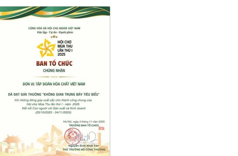 Trong khuôn khổ Hội chợ Mùa Thu năm 2025, với hơn 300 gian hàng trưng bày của các doanh nghiệp ngành Công Thương – những “đầu tàu” của công nghiệp và thương mại Việt Nam, Tập đoàn Hóa chất Việt Nam (Vinachem) đã ghi dấu ấn khi được Ban Tổ chức trao Giải thưởng “Không gian trưng bày tiêu biểu”.