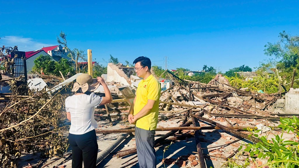 Đại diện Quỹ Thiện Tâm khảo sát hỗ trợ người dân sập nhà tại Nghệ An sau bão số 11. Ảnh: Bnews/vnanet.vn phát