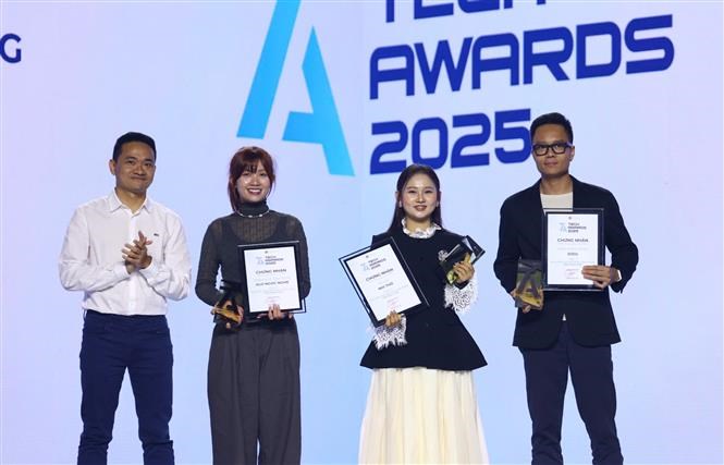 Ban tổ chức trao giải thưởng nhà sáng tạo nội dung công nghệ tiềm năng năm 2025 tại chương trình. Ảnh: Thu Hương - TTXVN