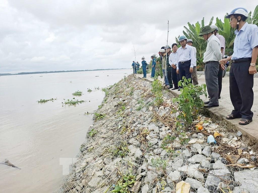 Đoàn công tác kiểm tra các điểm sạt lở tại tuyến đê bao ven sông Hậu (thuộc xã Phong Thạnh). Ảnh: Thanh Hòa- TTXVN