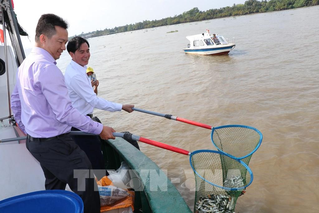 Đại biểu thả giống thủy sản xuống sông Cổ Chiên. Ảnh: Thanh Hòa - TTXVN
