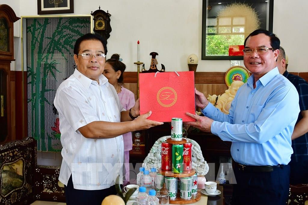 Bộ trưởng Bộ Dân tộc và Tôn giáo Nguyễn Đình Khang tặng quà, chúc Tết Hòa thượng Thạch Sok Xane, Phó Chủ tịch Hội đồng Trị sự Giáo hội Phật giáo Việt Nam, Trưởng ban Trị sự Giáo hội Phật giáo Việt Nam tỉnh Vĩnh Long, Chủ tịch Hội Đoàn kết sư sãi yêu nước tỉnh. Ảnh: Thanh Hòa - TTXVN