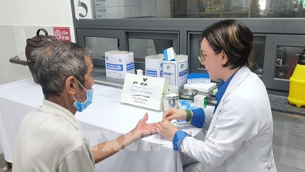 Thử đường huyết cho người dân xã Ba Tri (Vĩnh Long). Ảnh: Huỳnh Phúc Hậu - TTXVN
