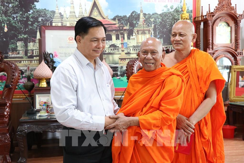 Bí thư Tỉnh ủy Vĩnh Long Trần Văn Lâu thăm và chúc Tết Chôl Chnăm Thmây Hòa thượng Thạch Sok Xane, Phó Chủ tịch Hội đồng Trị sự Giáo hội Phật giáo Việt Nam, Trưởng ban Trị sự Giáo hội Phật giáo Việt Nam tỉnh Vĩnh Long, Chủ tịch Hội Đoàn kết sư sãi yêu nước tỉnh, trụ trì chùa Âng, phường Nguyệt Hóa. Ảnh: Thanh Hòa - TTXVN
