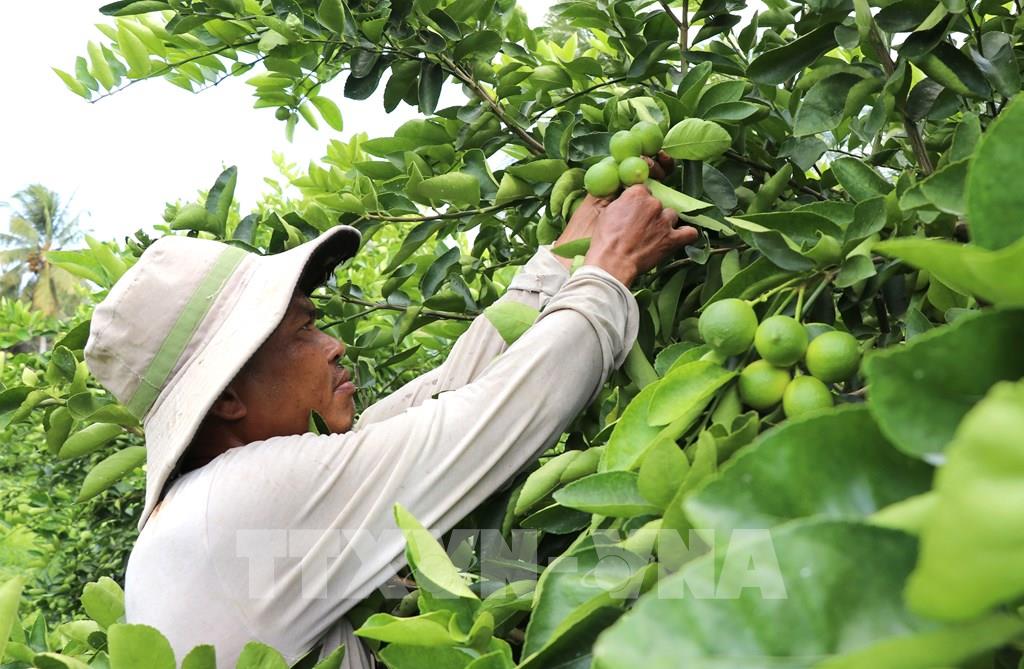 Mô hình trồng chanh không hạt xuất khẩu của đồng bào Khmer xã Song Lộc mang lại hiệu quả kinh tế cao. Ảnh: Thanh Hòa - TTXVN
