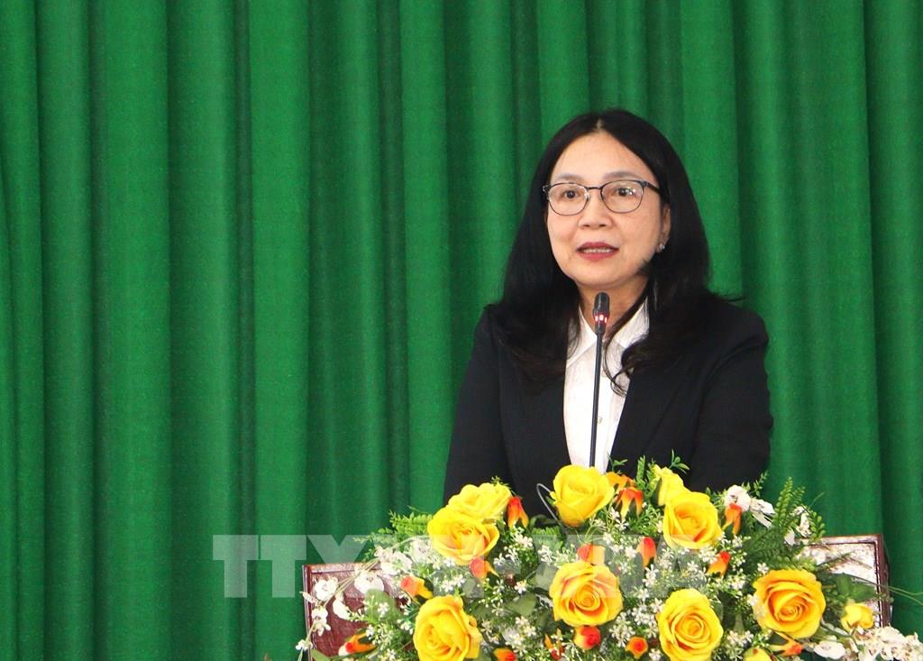 Giám đốc Sở Y tế tỉnh Vĩnh Long Hồ Thị Thu Hằng phát biểu tại Hội nghị. Ảnh: Lê Thúy Hằng – TTXVN