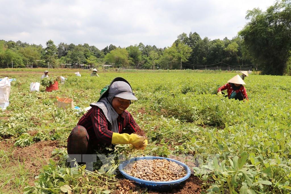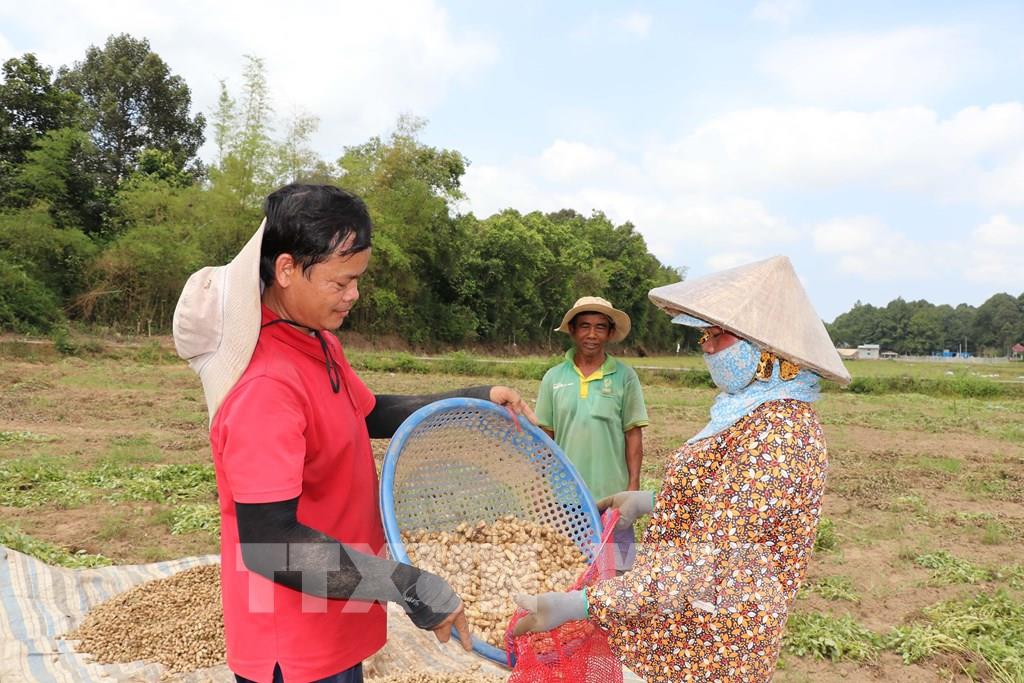 Đồng bào Khmer ở xã Long Hiệp thu hoạch lạc dịp Tết Chôl Chnăm Thmây. Ảnh: Thanh Hòa- TTXVN
