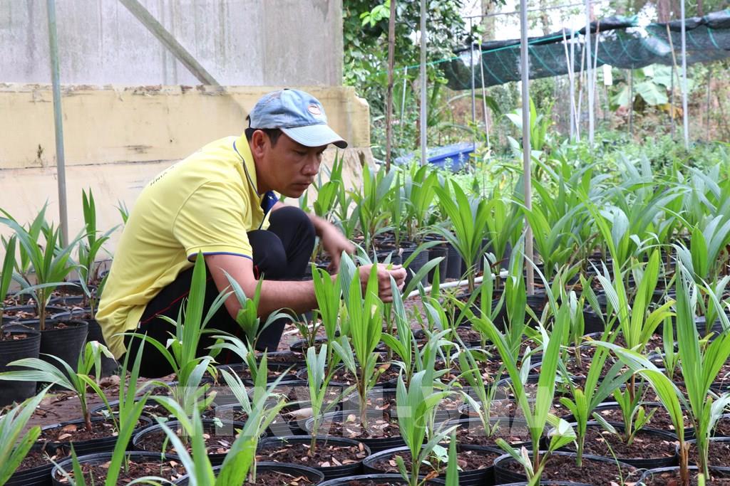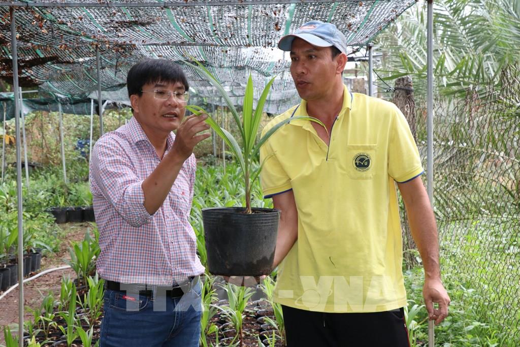 Cán bộ Trung tâm sinh học ứng dụng - Khoa Nông nghiệp thủy sản (Đại học Trà Vinh) theo dõi sinh trưởng và kiểm tra chất lượng cây giống dừa sáp tại khu thực nghiệm của trường. Ảnh: Thanh Hòa - TTXVN