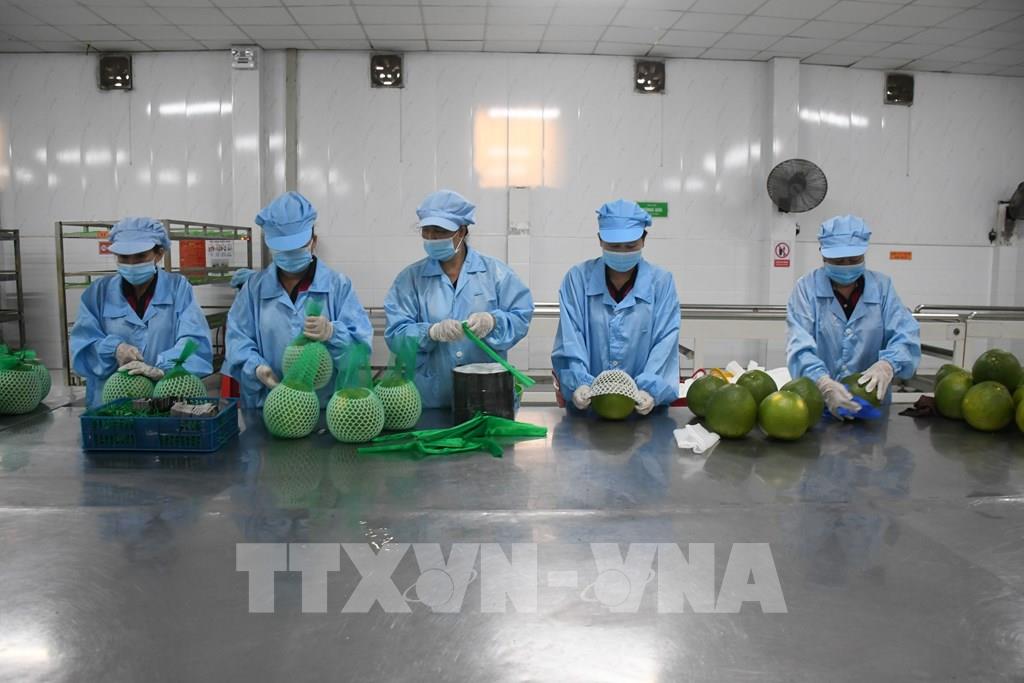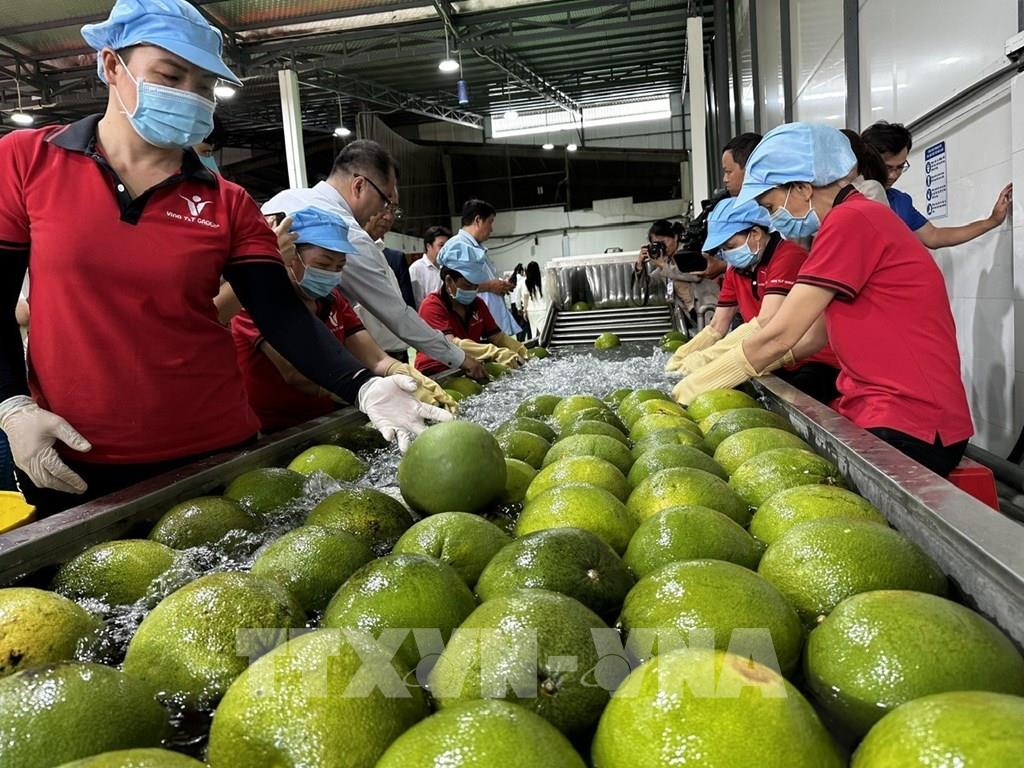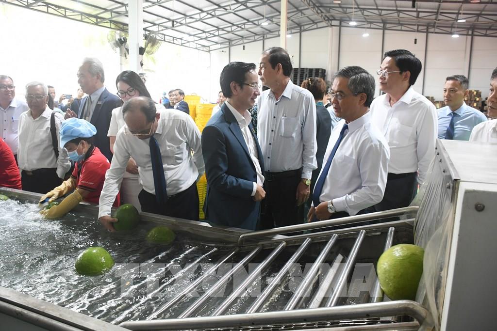 Đại biểu tham quan khu sơ chế bưởi da xanh tại nhà máy Kim Thanh (xã Giao Long, tỉnh Vĩnh Long). Ảnh: Huỳnh Phúc Hậu - TTXVN