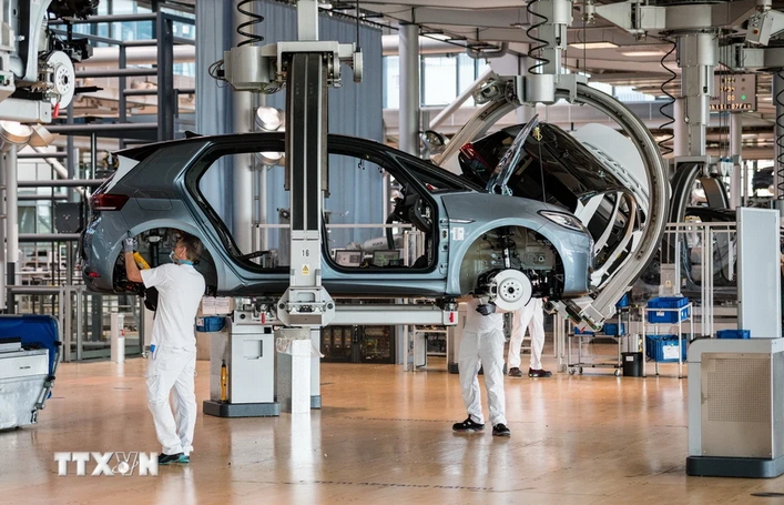 Công nhân làm việc trên dây chuyền sản xuất xe điện ID 3 của Tập đoàn sản xuất xe hơi Đức Volkswagen (VW). Ảnh: AFP/TTXVN