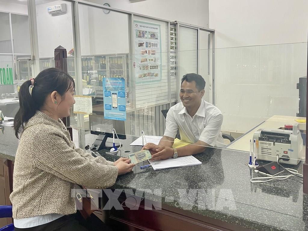 Bà Lê Thị Hường, thôn Sơn Trung, xã Phú Nghĩa, trở thành khách hàng đầu tiên được Phòng giao dịch giải ngân vốn vay theo chính sách mới với tổng số tiền 346 triệu đồng. Ảnh: K GỬIH -TTXVN
