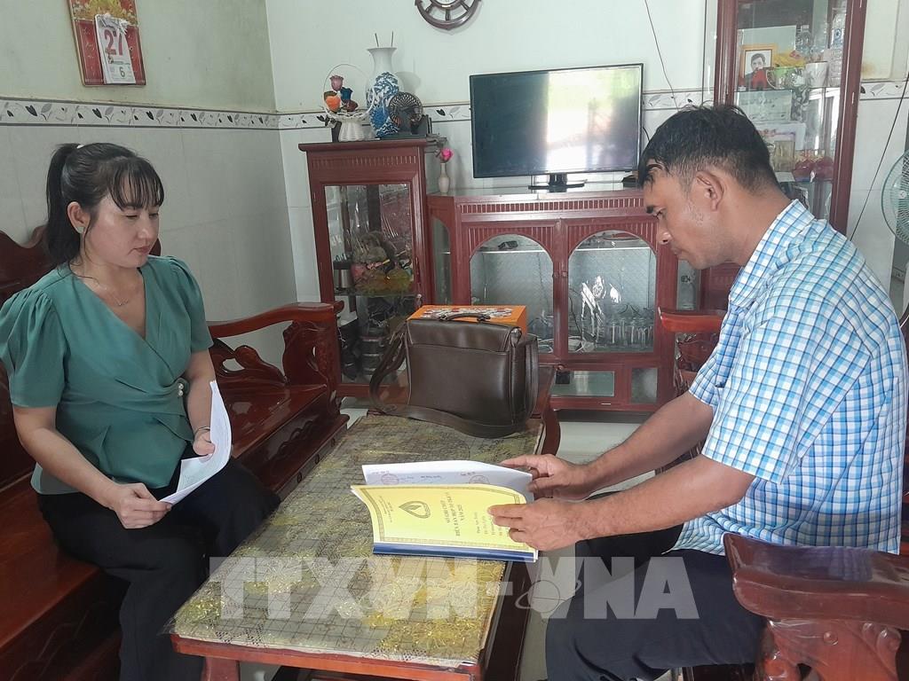 Tổ trưởng Tổ Tiết kiệm & Vay vốn hướng dẫn quy định vay vốn cho hộ gia đình bà Lê Thị Hường ở thôn Sơn Trung, xã Phú Nghĩa. Ảnh: K GỬIH -TTXVN