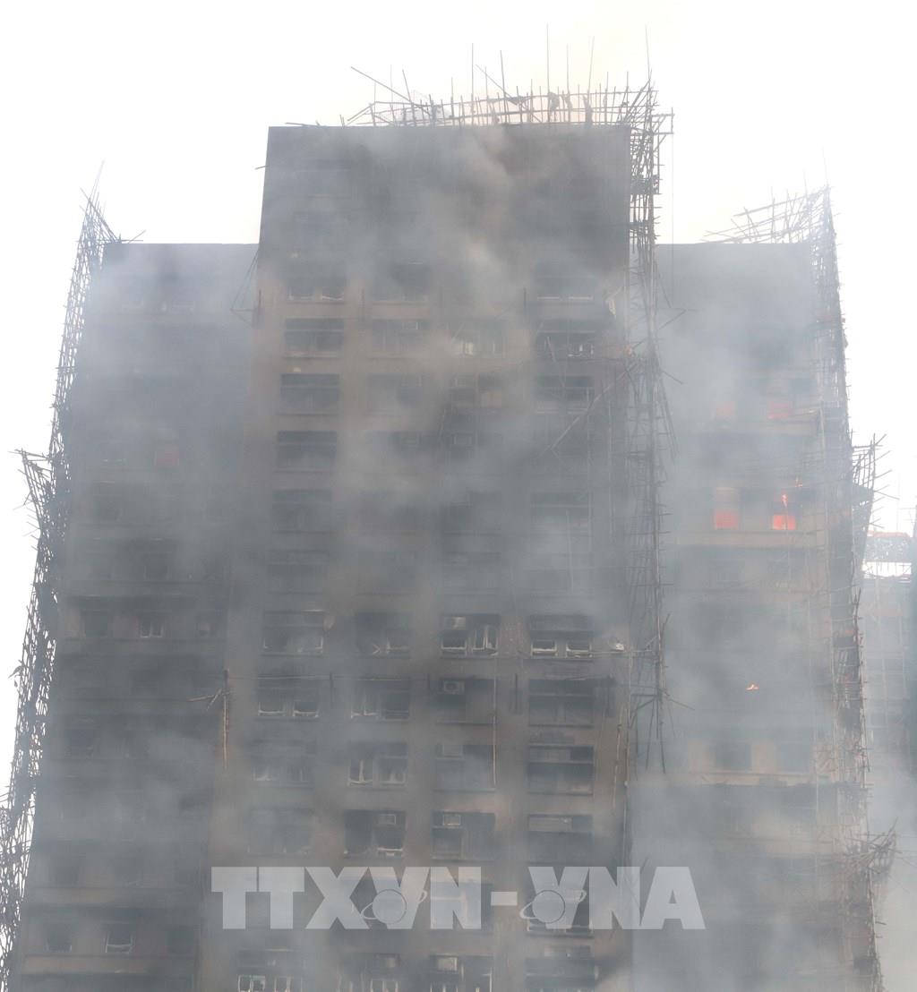 Lửa vẫn cháy âm ỉ trong một số căn hộ ở tầng cao. Ảnh: Xuân Vịnh - PV TTXVN tại Hong Kong (Trung Quốc)