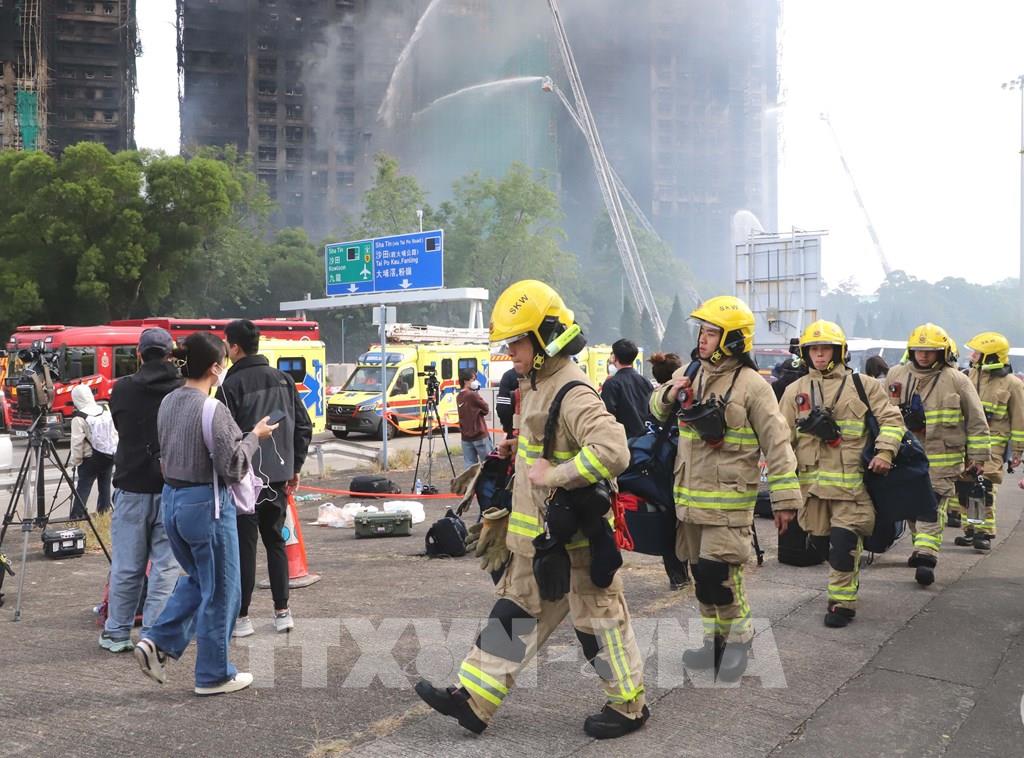 Các nhân viên cứu hộ tại hiện trường vụ cháy. Ảnh: Xuân Vịnh - PV TTXVN tại Hong Kong (Trung Quốc)