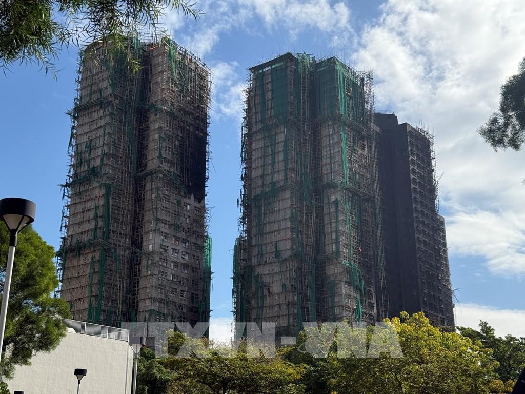Hiện trường khu tổ hợp chung cư Wang Fuk Cout vào sáng 29/11. Ảnh: Mạc Luyện PV TTXVN tại Hong Kong