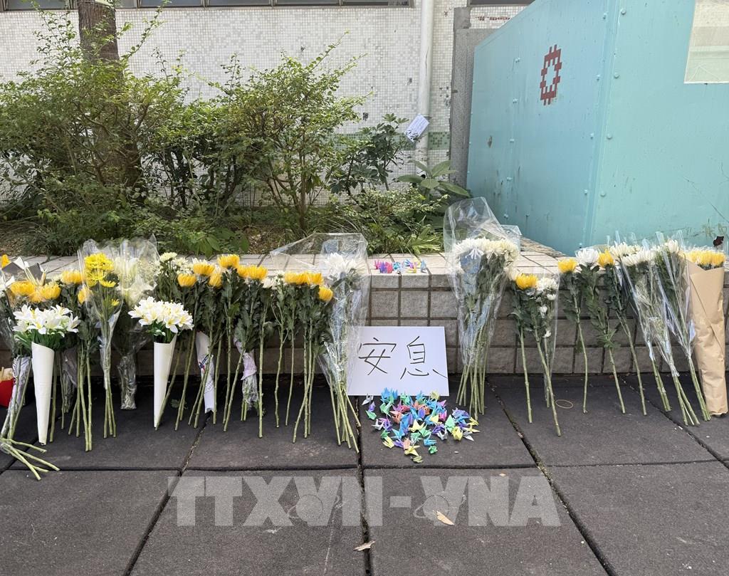 Dòng chữ "an giấc ngàn thu" được người dân viết cạnh các bó hoa để tưởng niệm các nạn nhân. Ảnh: Mạc Luyện PV TTXVN tại Hong Kong
