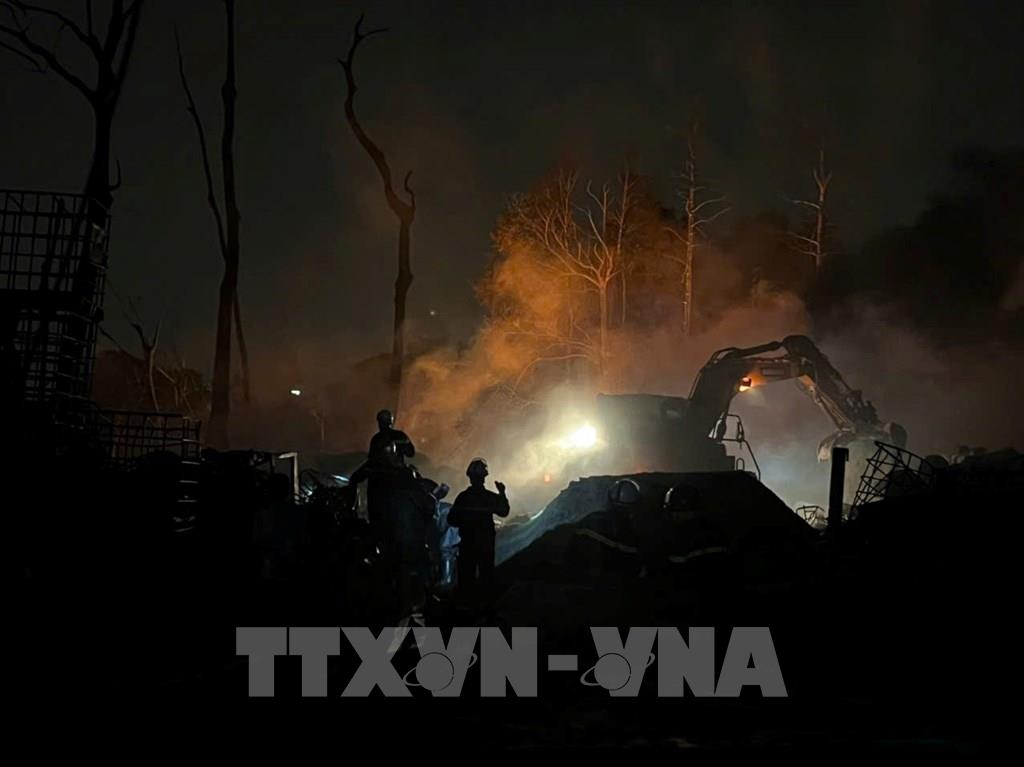 Do khu vực cháy có chứa cac phụ phẩm xăng dầu khiến việc dập lửa và cứu hộ gặp rất nhiều khó khăn. Hiện lực lượng chức năng cơ bản khống chế đám cháy và đang nỗ lực xử lý triệt để khu vực xảy ra hoả hoạn. Ảnh: Phạm Tuấn Anh - TTXVN