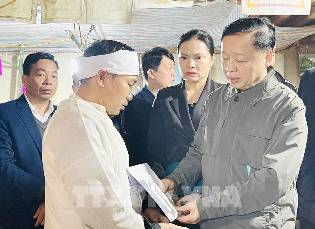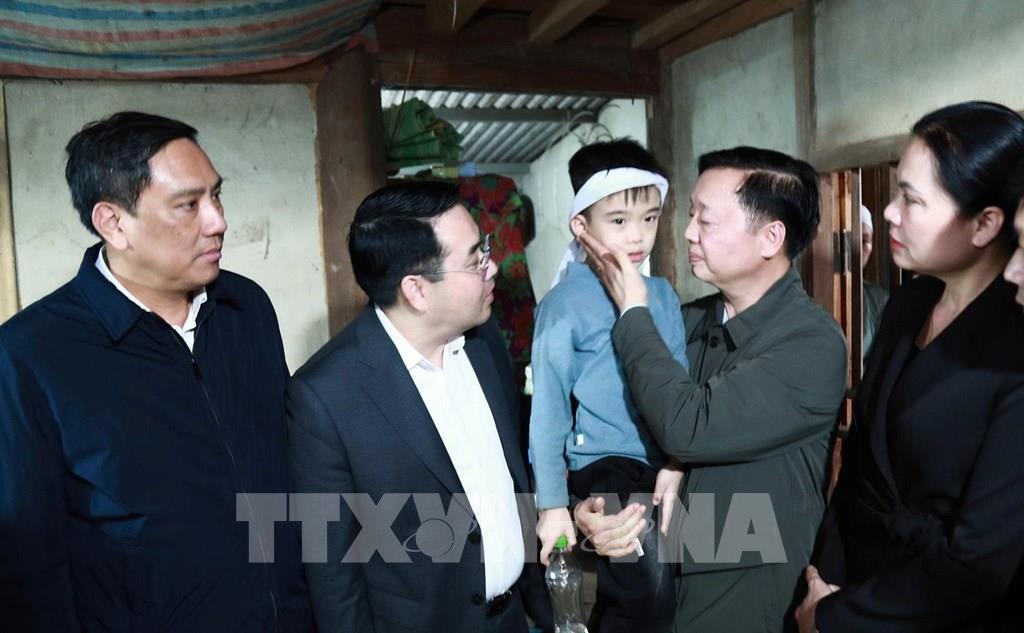 Phó Thủ tướng Trần Hồng Hà và Chủ tịch UBND tỉnh Lào Cai Nguyễn Tuấn Anh thăm hỏi, trao quà hỗ trợ cho các gia đình có người thân bị tử vong. Ảnh: Đinh Thùy - TTXVN
